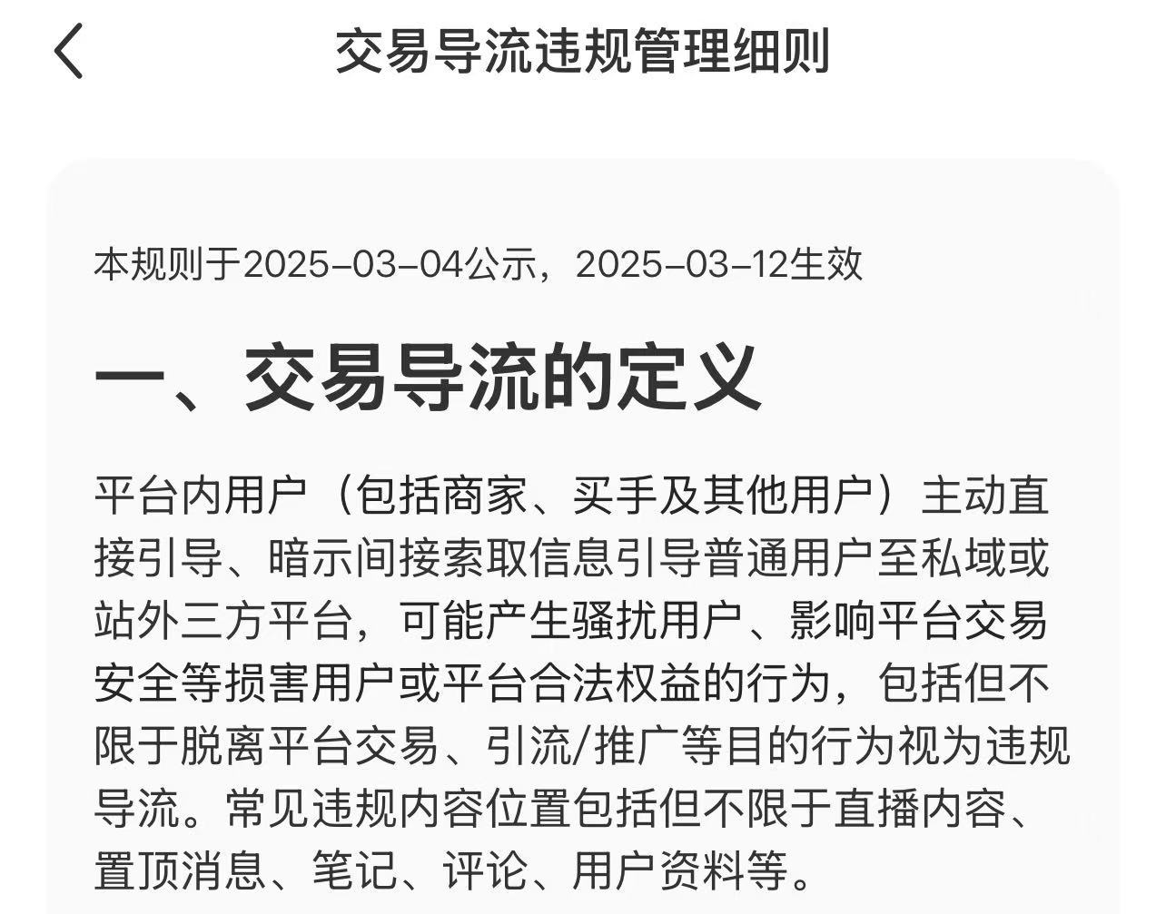 根據細則,“交易導流”是指用户(包括商家、買手和其他用户)主動直接引導、暗示間接索取信息引導普通用户至私域或站外三方平台的行為。具體違規類型包括:傳播個人/社羣聯繫方式或其他平台的賬號/店鋪信息。引導用户查看、添加、提供、交換私域信息/三方信息。