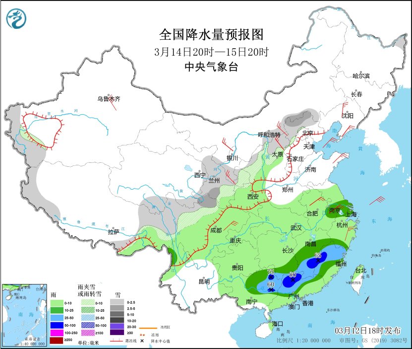 *3月14日20時至15日20時,*新疆南疆西部山區、西北地區東部、華北北部、川西高原北部等地部分地區有小雪或雨夾雪,局地有中雪。江淮東部、江南南部、華南大部等地部分地區有中到大雨,其中,江西東南部、福建西部、廣西東北部、廣東北部等地部分地區有暴雨(50~80毫米)。西北地區東部、內蒙古中西部、山西北部、遼寧大部、蘇皖大部等地部分地區有4~6級風(見圖3)。