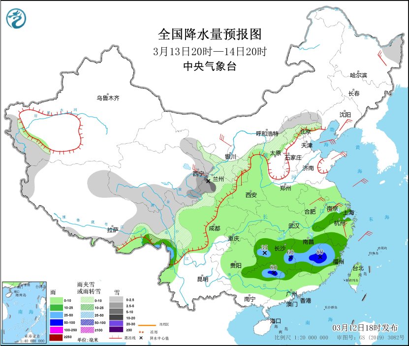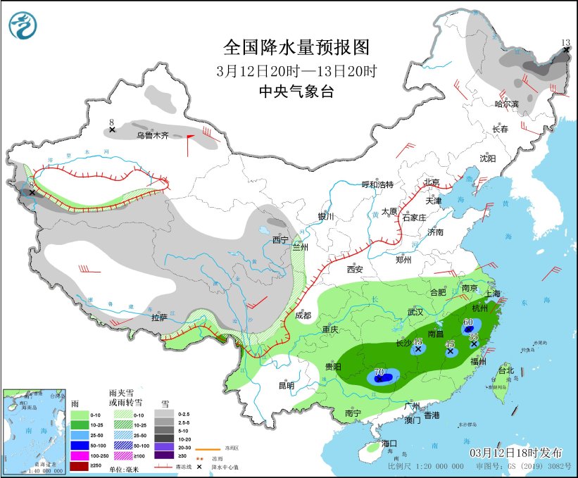 *3月12日20時至13日20時,*內蒙古東北部、黑龍江大部、新疆沿天山地區和南疆西部和南部山區、西藏北部和東部、青海大部、甘肅西南部、川西高原中北部等地部分地區有小到中雪或雨夾雪,其中,黑龍江東北部等地部分地區有大雪,局地暴雪(10~13毫米)。江南大部、華南北部、貴州東部等地部分地區有中到大雨,其中,湖南南部、廣西東北部、浙江西南部、福建西北部等地局部地區有暴雨(50~70毫米)。內蒙古中東部、黑龍江中東部、吉林東部、遼東半島、山東半島、安徽中南部、浙江東部等地部分地區有4~6級風,西藏中部部分地區有6~7級風(見圖1)。