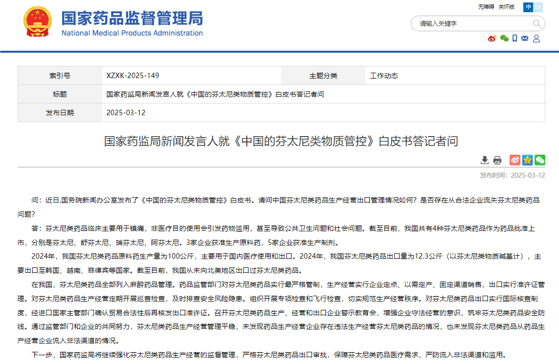 國家藥監局新聞發言人就《中國的芬太尼類物質管控》白皮書答記者問