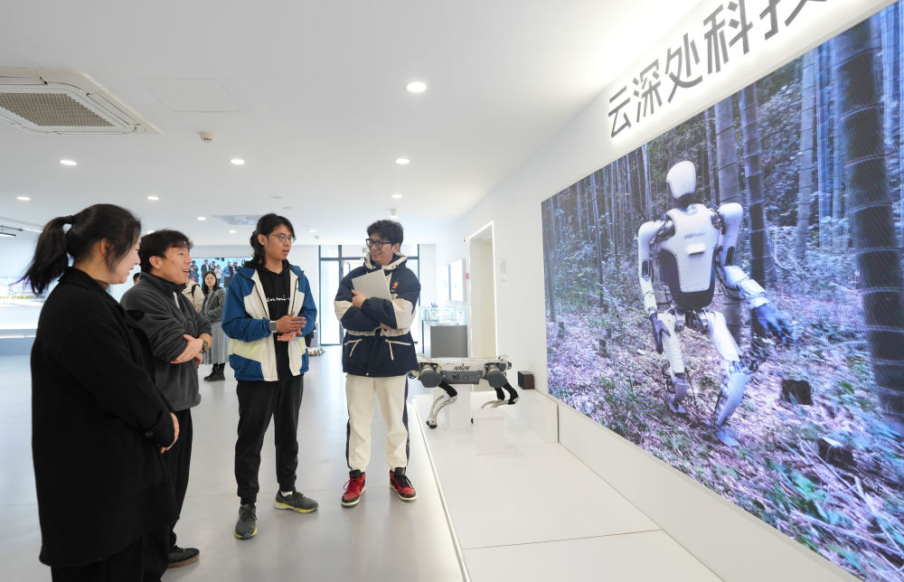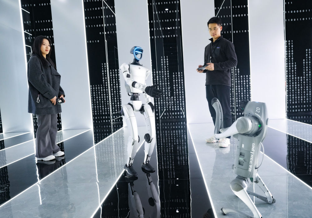 3月1日,在杭州宇樹科技有限公司的產品展示中心,人形機器人和四足機器人在工作人員控制下做動作。新華社記者 翁忻暘 攝