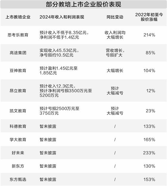 業績回暖、股價企穩,是近兩年教培上市企業發展的主基調。目前,包括思考樂教育、學大教育、豆神教育在內的多家教培企業股價、市值,均已超過“雙減”前。