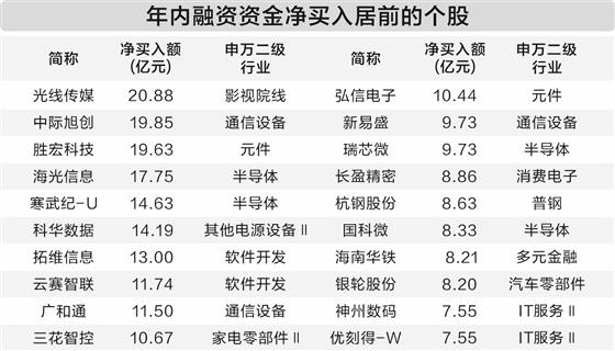據數據寶統計,2025年以來,有55股融資淨買入額超過5億元,11股淨買入額在10億元以上。光線傳媒排在首位,融資淨買入額為20.88億元;中際旭創、勝宏科技、海光信息隨後,淨買入額均超過15億元。