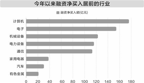 從行業來看,申萬一級行業中,計算機、電子、機械設備、電力設備和通信等行業融資淨買入額在百億元以上,其中計算機和電子兩個強科技屬性的行業買入力度最大,均在150億元以上。