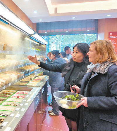 在柏林市中心,一家新開不久的“楊國福麻辣燙”店門口,當地人納爾夫和幾個好友推門而入。店內熱氣騰騰,空氣中瀰漫着濃郁的骨湯香氣。在排隊取餐的人羣中,不乏像納爾夫這樣的外國朋友。他們拿起夾子和菜盆,熟練地自選食材(見圖②,本報記者劉赫攝):藕片、菠菜、凍豆腐、寬粉、蝦和牛肉卷……幾分鐘後,一碗香氣四溢的麻辣燙被端上餐桌。