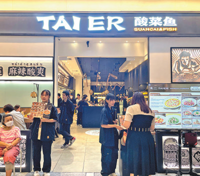 黑白色調的裝飾,開放式廚房,可愛的公仔,有趣的掛畫……太二酸菜魚在泰國的第一家店開在曼谷最繁華的一家商場,店內的裝修風格十分別致。記者在店員熱情的口號聲中被迎進店裏。正值晚餐高峯期,店內座無虛席,還有人在排隊等座(見圖①,本報記者劉慧攝)。基本上每桌都會點一道酸菜魚。雪白的魚片被盛在一個大盤子裏,配上爽脆的酸菜、金黃的菊花瓣、紅色的辣椒,酸香麻辣,令人食指大動。