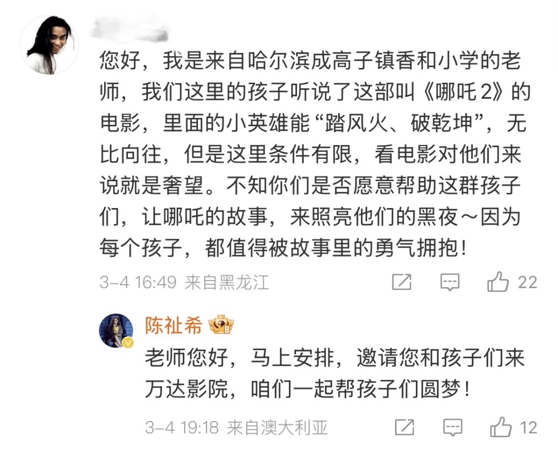 “夢想電影院”項目的啓動源於一場“微博促成的光影之約”。3月初,萬達電影在官方微博上看到一名哈爾濱鄉村教師為學生爭取觀影機會的留言後,迅速響應並安排,成功促成學生們在哈爾濱IMAX GT影廳觀看了《哪吒2》。這一行動不僅讓孩子們實現了觀影願望,更讓他們感受到了社會的關愛和温暖。