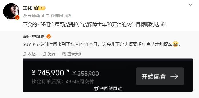 【環球網科技綜合報道】3月13日消息,有用户在微博發文表示,“SU7 Pro交付時間來到了驚人的11個月,這會兒下定大概要明年春節才能提車。”對此,小米集團公關部總經理王化轉發了該微博並回復。