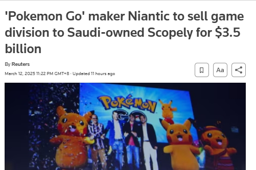 【環球網財經綜合報道】據路透社報道,知名遊戲開發商Niantic Labs宣佈,將以35億美元將其視頻遊戲部門出售給沙特阿拉伯擁有的Scopely。值得一提的是,Niantic在未能重現其2016年爆款遊戲《精靈寶可夢GO》(Pokemon Go)的成功後,將公司重心轉向了地理空間技術。