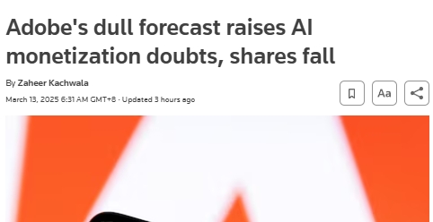 值得一提的是,Adobe正在加大投資,通過在其龐大的產品組合中融入更強大的AI編輯工具,以此來區別於競爭對手。然而,分析師和投資者正在關注Adobe何時能夠加快其生成式人工智能產品的變現速度。M Science的高級研究分析師Parker Snook 稱,“我認為指導方針有些粗略,而且人們在質疑,AI的變現速度是否足夠快?”