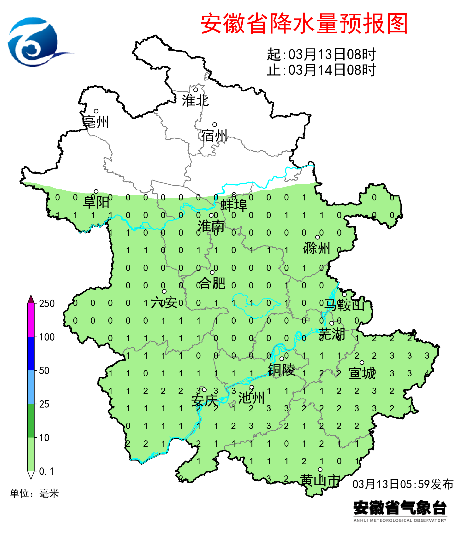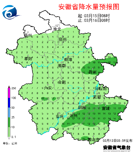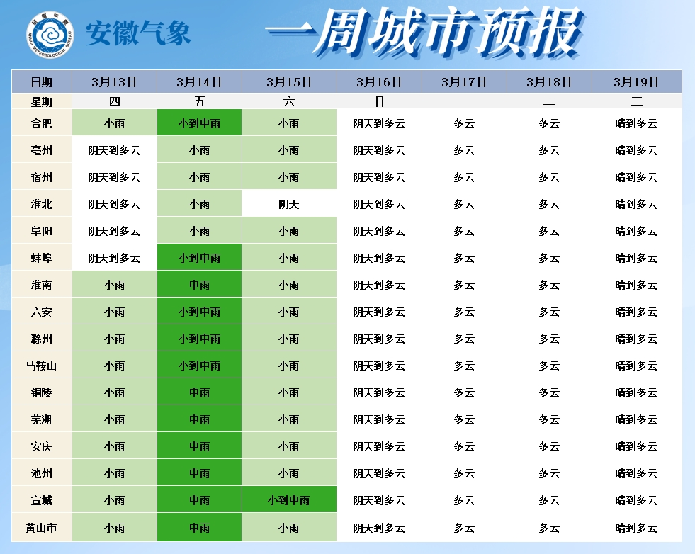 3月13日,安徽大部天氣陰沉,淮河以南部分地區維持小雨天氣。當天上午,安徽省氣象台發佈最新預報,預計13日到15日安徽省仍有降水,其中14日江淮之間部分地區和江南有中雨。15日,淮河以南部分地區中雨,高海拔山區有雨夾雪或雪。16日後,全省以多雲天氣為主。