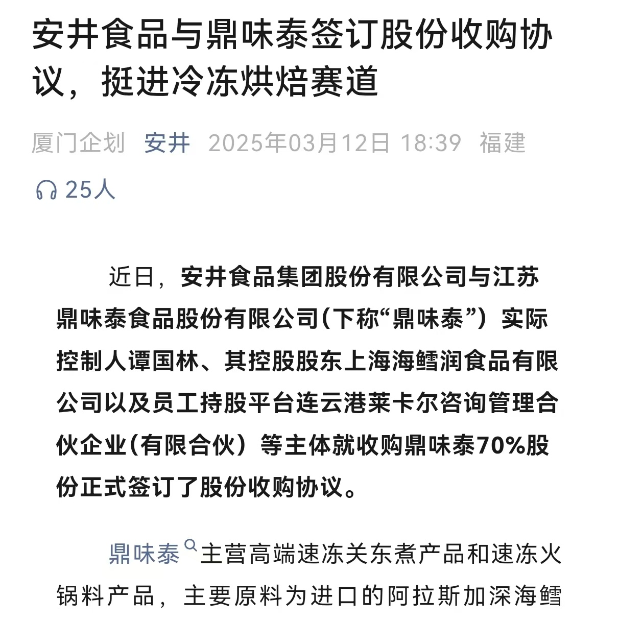 安井食品一直致力於通過產融結合的資本運作,推動公司高質量發展。此次收購鼎味泰70%股權,是安井食品在速凍食品主業上的進一步擴張,也是其品牌中高端化和銷售渠道多元化戰略的重要一步。