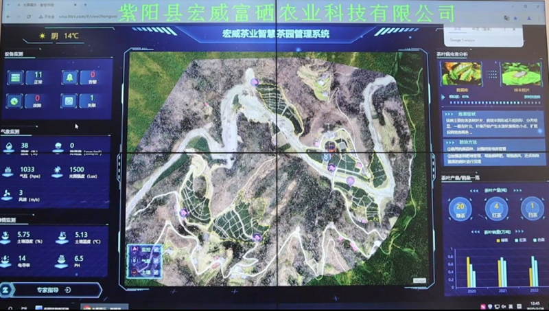 “温度14℃,氣壓1033hpa,風速3m/s,一切正常。”在紫陽縣宏威富硒農業科技有限公司的辦公室裏,生產負責人江其林正通過智慧茶園管理大屏查看茶園的環境數據。
