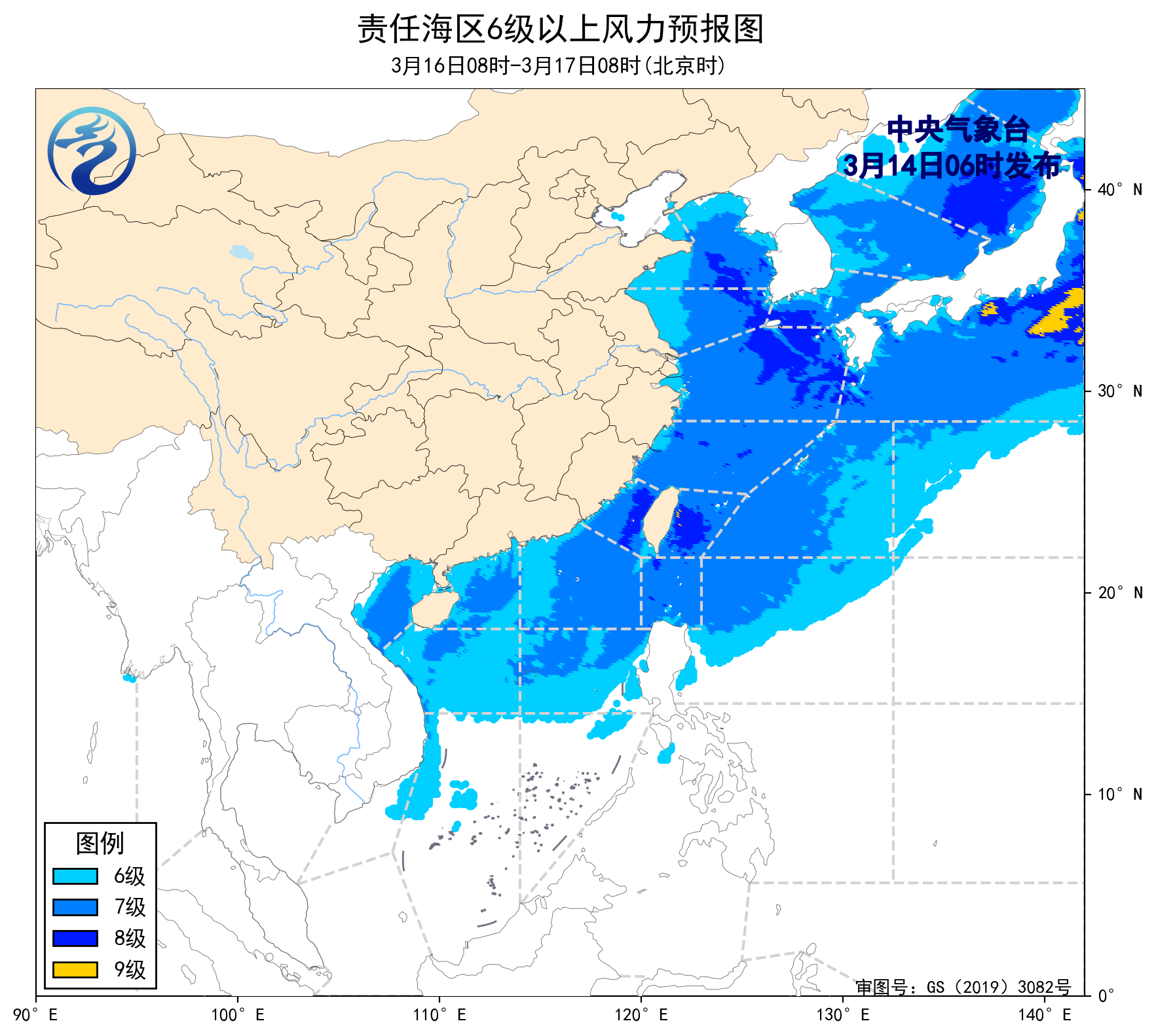 16日08時至17日08時,黃海中部和南部海域、東海北部海域將有6~8級、陣風9級的西北風,台灣海峽、台灣以東洋麪將有7~8級、陣風9級的偏北到東北風,黃海北部海域將有6~7級、陣風8級的西北風,東海南部海域、巴士海峽、北部灣、南海北部和中部海域將有5~7級、陣風8級的偏北到東北風,渤海海峽將有4~6級、陣風7級的西北風,瓊州海峽、南海西南部海域將有4~6級、陣風7級的東北風。