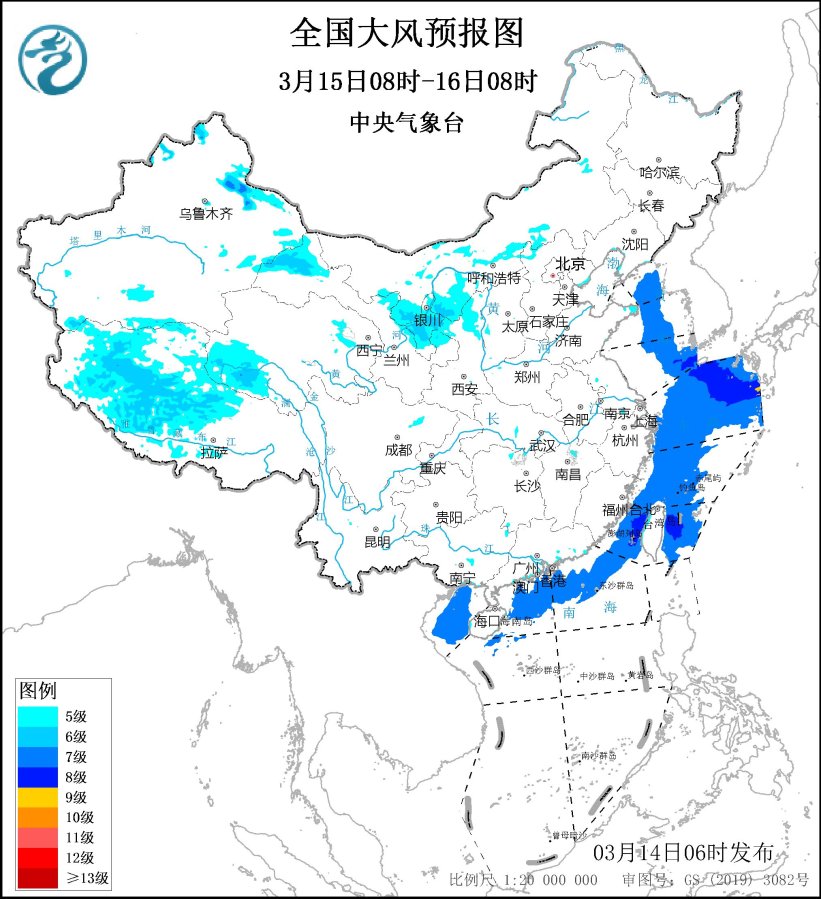 預計,3月14日08時至15日08時,新疆東部和南疆盆地、西藏中北部、青海北部、甘肅北部和東部、內蒙古中西部、寧夏等地部分地區有5~6級風、陣風7~8級;黃海東南部海域、東海北部海域將有7~8級、陣風9級的大風。