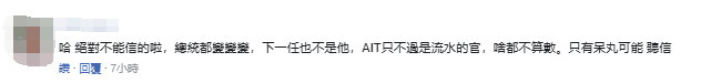 對於這番説辭,有島內網友表示,“絕對不能信的啦,(美國)總統都變變變,下一任也不是他,AIT只不過是流水的官,啥都不算數。只有台灣可能聽信”。