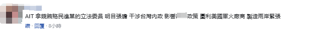 還有網友斥責,“AIT拿錢賄賂民進黨的‘立委’,明目張膽干涉台灣事務,影響當局政策,圖利美國軍火廠商,製造兩岸緊張”。