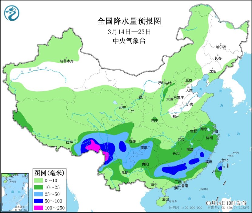未來10天(3月14-23日),江南中南部、華南中北部及四川南部、貴州北部、四川西南部、雲南北部、西藏東部等地累計降水量有20~40毫米,部分地區有50~90毫米,西藏東南部和雲南西北部的局部地區可達100~160毫米。