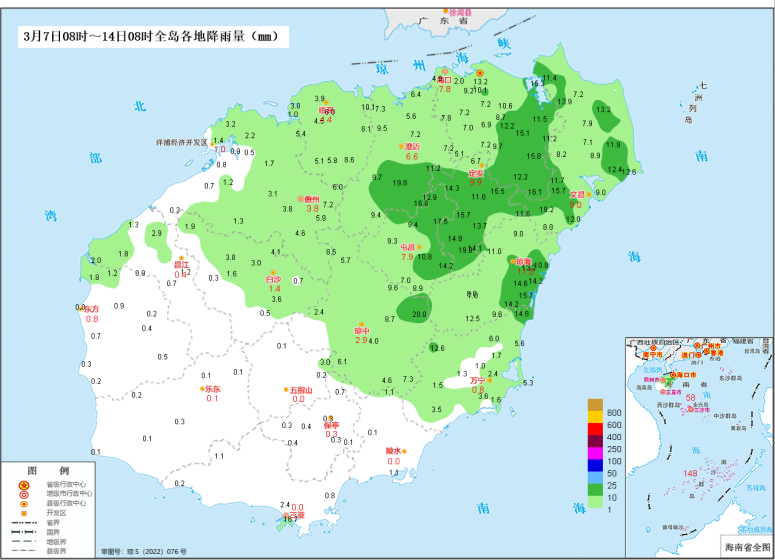 2025年3月7日08時~14日08時海南全島雨量(單位:毫米;圖中紅色數字為城區測站雨量,黑色數字為鄉鎮自動站雨量)