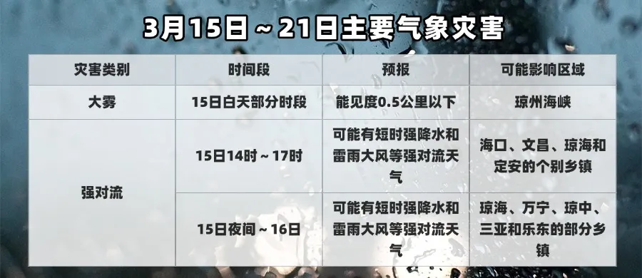 (一)15日白天瓊州海峽將受短時團霧影響,請相關部門加強通航管理;15日夜間起海南島氣温將大幅下降,建議呼吸道和心腦血管疾病等敏感人羣,注意及時增添衣物,做好健康防護。