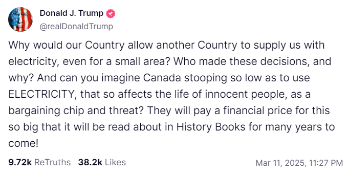 特朗普11日在“真實社交”平台發文質問:“為什麼我們的國家會允許另一個國家為我們供電,即使是一小塊地區?”他還表示,加拿大正在用影響美國人生活來作為與美國談判的籌碼和威脅。