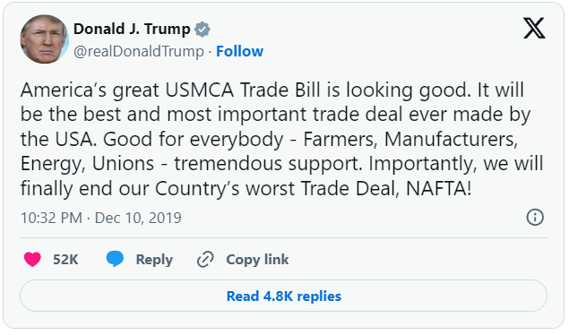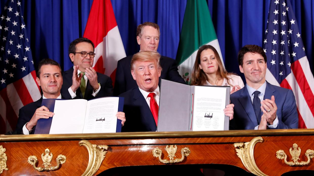 該協議由特朗普在2018年11月完成談判,隨後他和時任加拿大總理及墨西哥總統一同出席了協議簽署儀式。根據美國國會官網的法案存檔記錄,該協議於 2020年1月被正式通過生效。