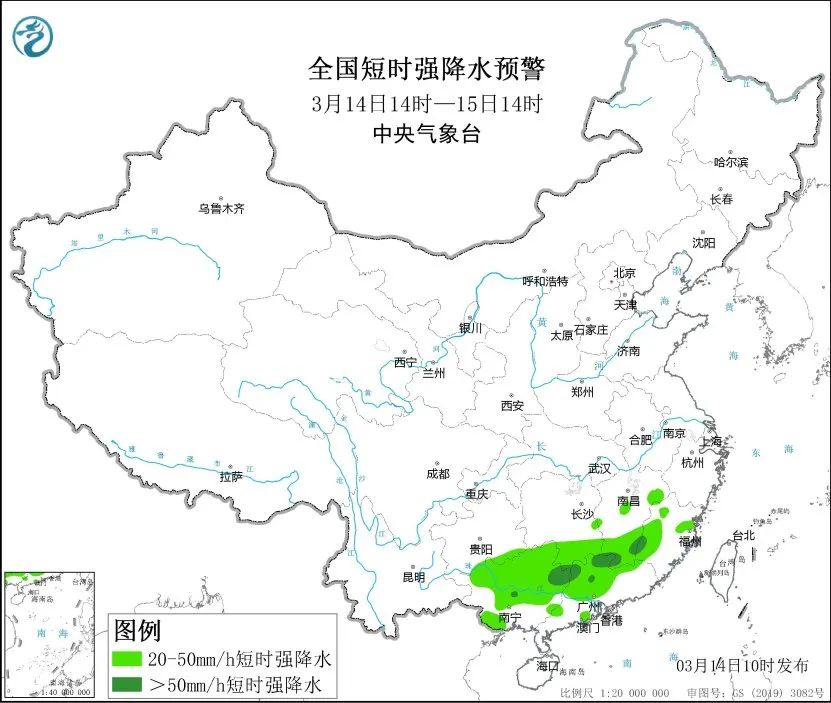 預計3月14日14時至15日14時,湖南南部、江西南部、廣西中北部、廣東北部等地的部分地區將有8級以上雷暴大風或冰雹天氣,其中廣西北部等地的部分地區將有10級以上雷暴大風;此外,湖南南部、江西南部、福建西部、廣西中北部、廣東北部等地的部分地區將有小時雨量大於20毫米的短時強降水天氣,其中江西南部、廣西北部、廣東北部等地的部分地區小時雨量大於50毫米,最大可達60毫米以上。