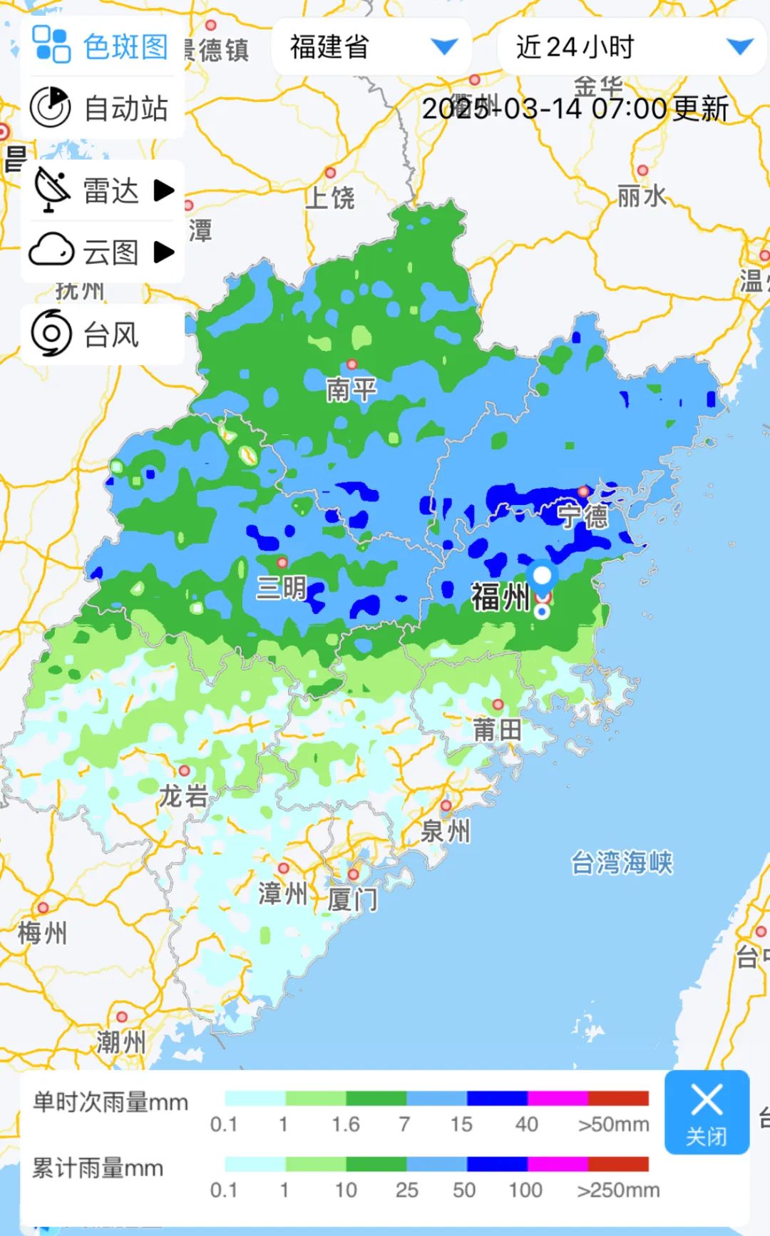 *福建省氣象台2025年03月14日06時52分發布暴雨警報:*今天白天到夜間,三明、龍巖、南平三市的部分縣市和福州北部的局部縣市有暴雨,局部大暴雨。24小時累計雨量50~80毫米,局部可達110毫米。