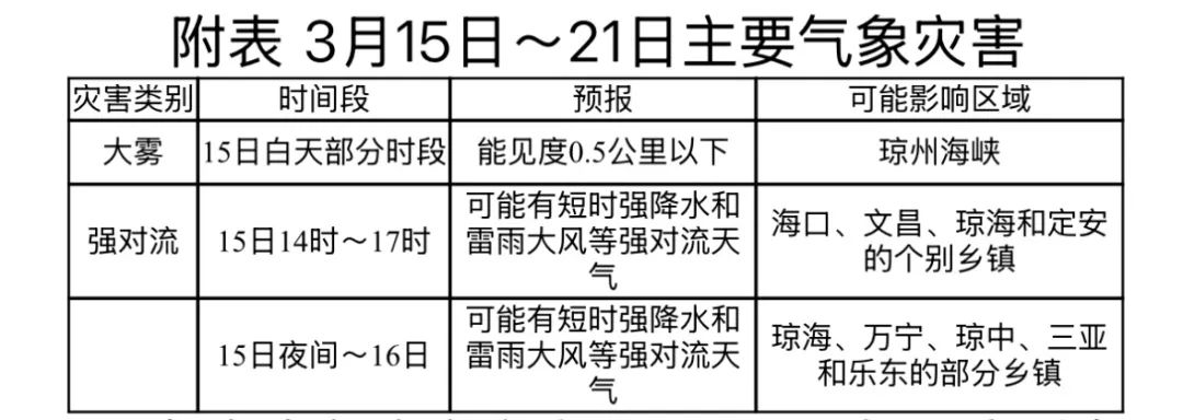 15日~17日,海南島部分市縣的局部地區可能有短時強降水和雷雨大風等強對流天氣,户外作業人員需及時關注氣象災害預警信號,做好防禦工作。