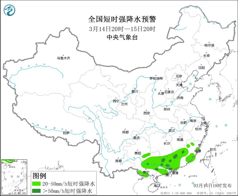 預計3月14日20時至15日20時,江西南部、廣西中東部、廣東等地的部分地區將有8級以上雷暴大風或冰雹天氣,其中,廣西中部和東北部、廣東北部等地的部分地區將有10級以上雷暴大風;此外,江西南部、福建、廣西中東部、廣東等地的部分地區將有小時雨量大於20毫米的短時強降水天氣,其中,江西南部、福建西部、廣西中部和東部、廣東中北部等地的部分地區小時雨量大於50毫米,最大可達60毫米以上。