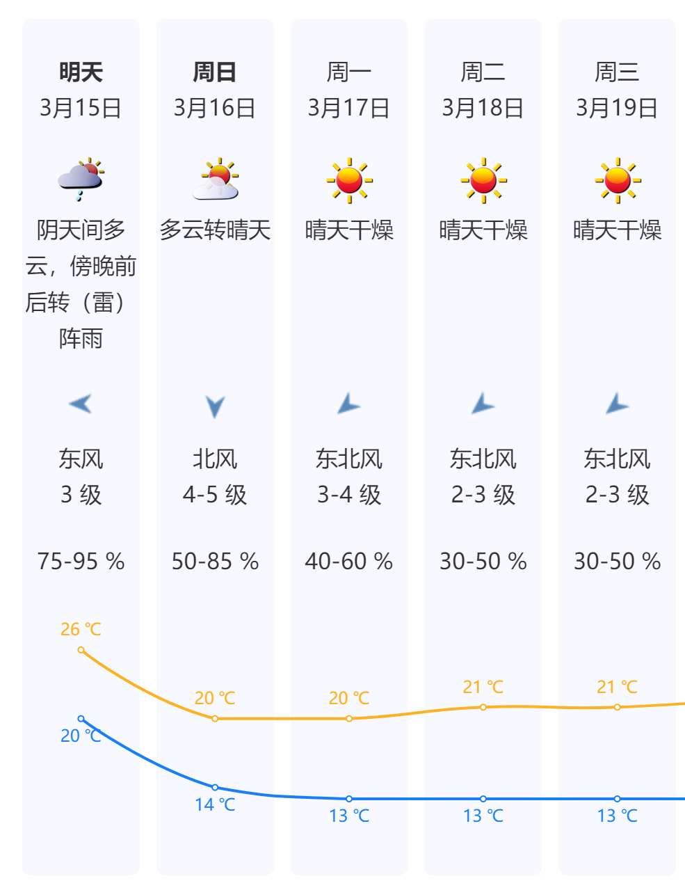 3月15日下午至夜間,多雲轉陣雨局部大雨,伴有雷暴和6級-8級局地短時大風;
