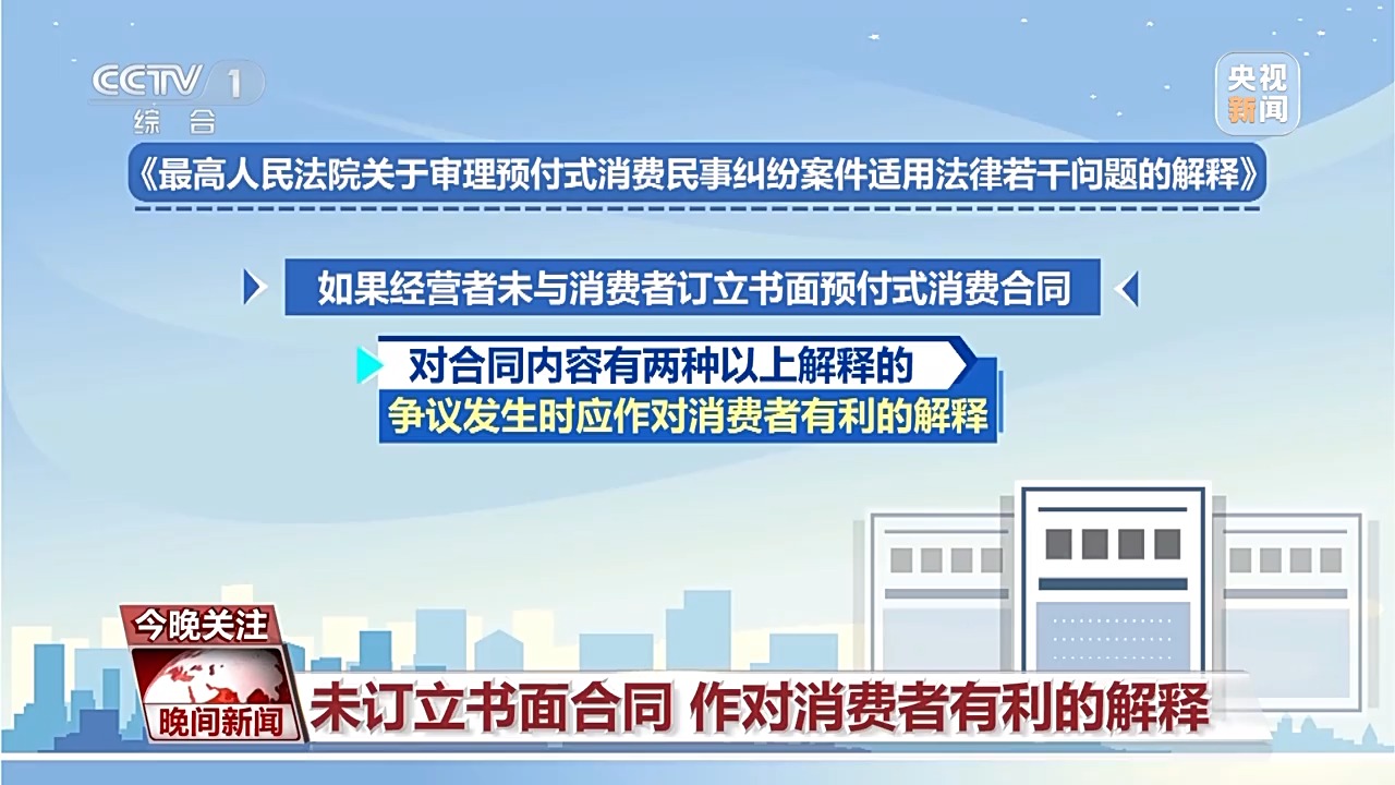 司法解釋規定:如果經營者未與消費者訂立書面預付式消費合同,對合同內容有兩種以上解釋的,爭議發生時,應作對消費者有利的解釋。此外,司法解釋還規定了經營者提供證據的責任。