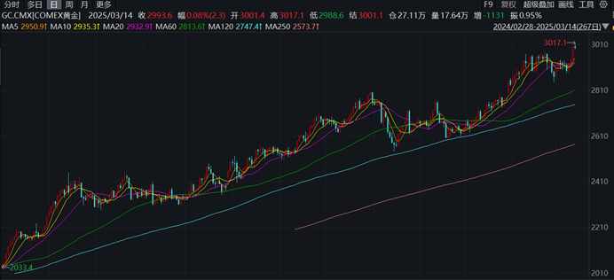 此前一日,現貨黃金首次突破每盎司3000美元這一心理關口,再度刷新歷史新高。不過,隨後金價有所回落。對此有券商分析指出,黃金期貨價格創歷史新高,主要緣於美國關税政策,以及市場對美聯儲降息預期升温。