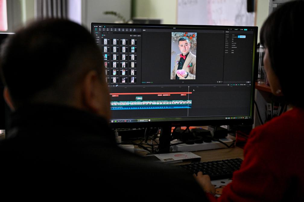 在新疆伊犁哈薩克自治州察布查爾錫伯自治縣,依木拉·亞爾買買提(左)和編導在工作室編輯短視頻(3月11日攝)。新華社記者 丁磊 攝