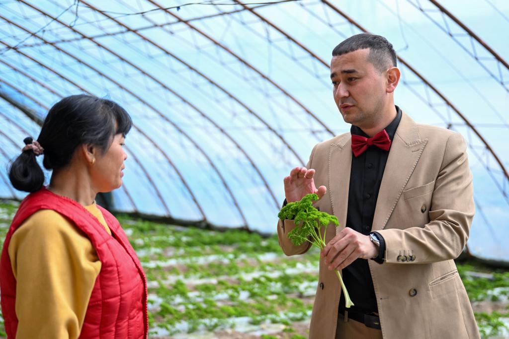 在新疆伊犁哈薩克自治州察布查爾錫伯自治縣科技示範基地,依木拉·亞爾買買提(右)和農户交流(3月7日攝)。新華社記者 丁磊 攝