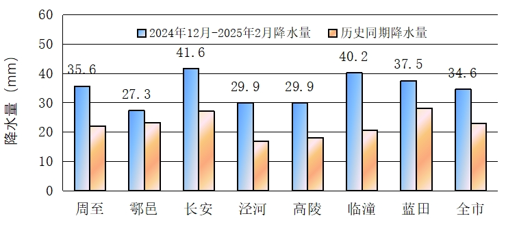 2024年12月-2025年2月西安各區縣降水量與歷史同期對比圖