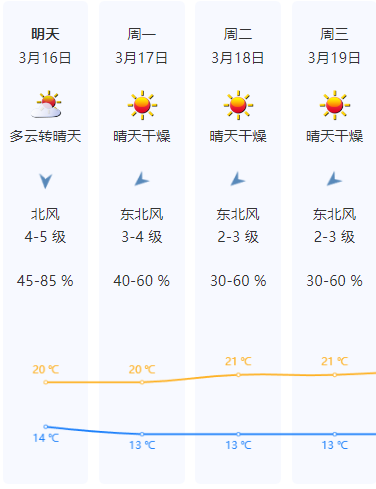 17-19日受陸續補充的冷空氣影響,晴天干燥,最低氣温降至13℃左右,早晚清涼,晝夜温差大。