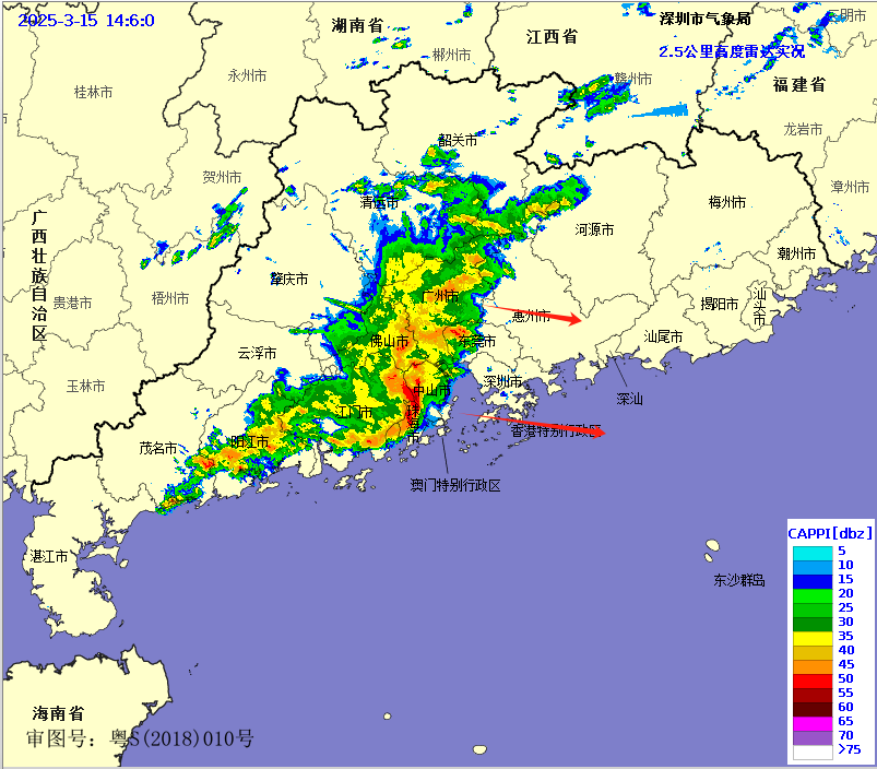 深圳市氣象台2025年03月15日14時10分在南山區、福田區、寶安區、光明區、龍華區和珠江口發佈雷雨大風黃色和暴雨黃色預警信號,預計受雷雨雲團影響未來1-3小時上述區域將出現30-50毫米降水,並伴有強雷電和8級左右短時大風。全市進入暴雨戒備狀態。上述區域存在山洪風險,請注意防禦暴雨可能引發的局部內澇、山洪等災害。請落實各項防風防雷電措施。