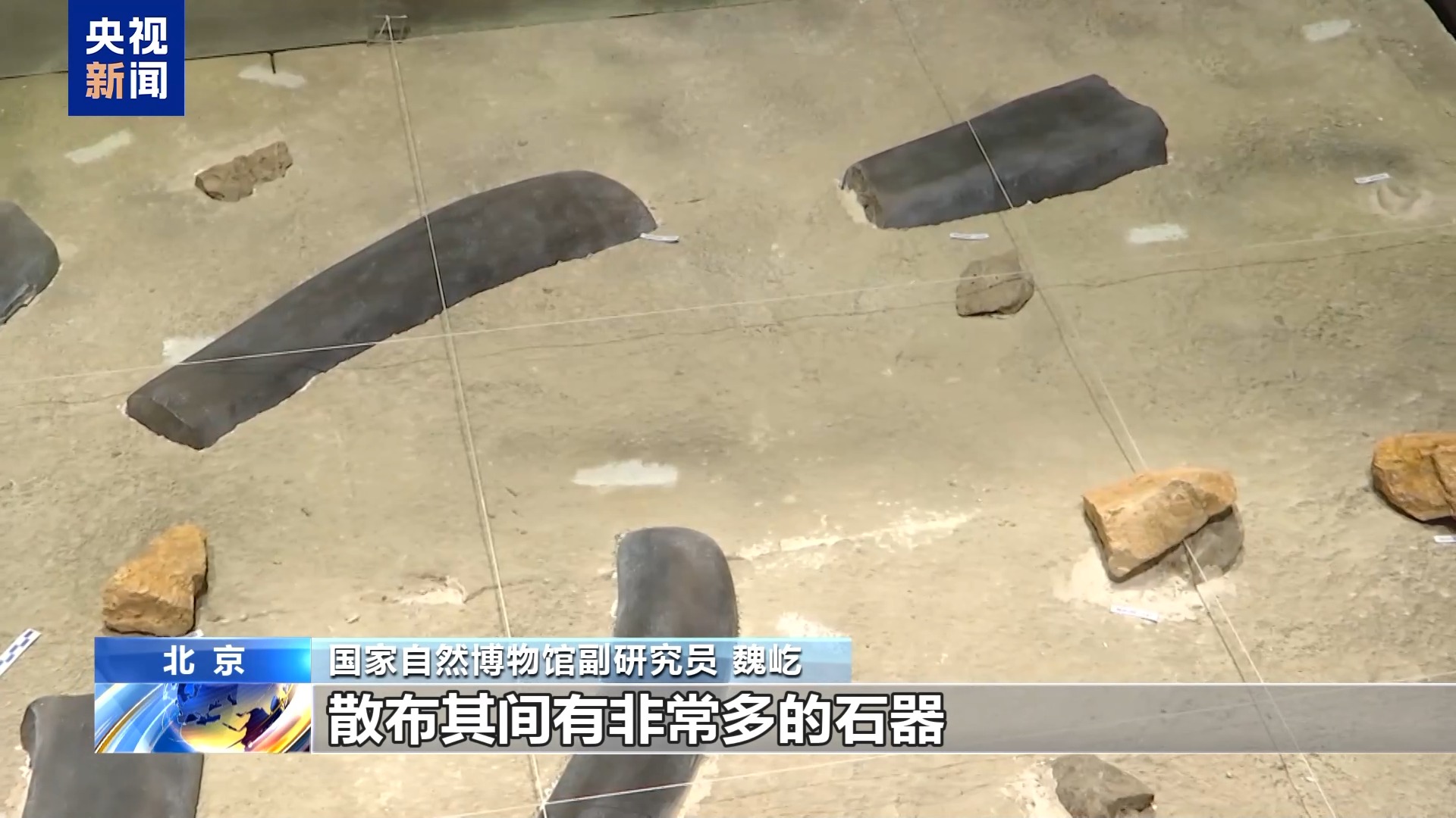 *國家自然博物館副研究員 魏屹:*灰色的是一頭草原猛獁象的骨骼,散佈其間有非常多的石器,包括石核、石片,還有一些刮削器等。其中,有一個刮削器,在出土的時候,還保持着和動物化石密切接觸的狀態。另外,在很多骨骼上面,我們發現有非常明顯的砍砸,還有切割的痕跡,所以説明當時古人類可能在這裏進行過石器的加工,並且用加工之後的工具對草原猛獁象進行了肢解、切割還有餐食的活動。距今大約166萬年,我們把這個場景稱為“東方人類的第一餐”。