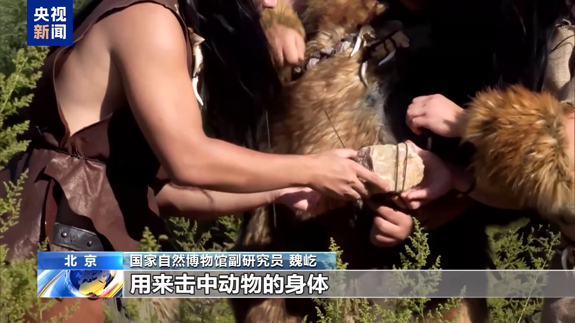 *國家自然博物館副研究員 魏屹:*我們把它叫作石球,它被推測可能是用來狩獵野馬和野驢的,這個是怎麼使用的呢?用繩索把它捆綁起來,製成流星鎖,然後投擲出去,用來擊中動物的身體,可能還會纏繞住它們的腿部,能夠提高他們的狩獵效率。所以推測當時許家窯人已經具備了比較成熟的狩獵能力,他們又被稱為獵馬人。