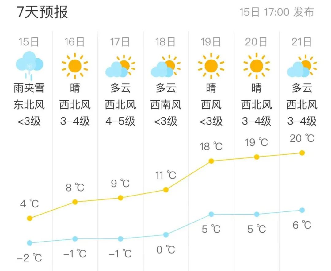 *15日夜間,*陰,西部南部有雨夾雪或雪轉晴,東轉北風,2、3級,最低氣温-2℃。