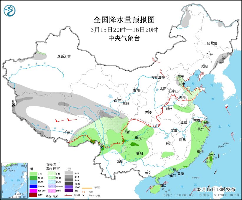 *3月15日20時至16日20時,*內蒙古東北部、黑龍江北部、吉林東部、新疆南疆盆地、西藏北部、青海南部、華北中東部、黃淮東部、川西高原北部等地的部分地區有小到中雪或雨夾雪,局地有大雪(5~9毫米)。西藏東部、西南地區東部和南部、江南東部和南部、華南中南部、海南島、台灣島等地的部分地區有小到中雨,局地有大雨(25~30毫米)。西藏中北部、內蒙古中部、遼東半島、山東半島、浙江北部等地部分地區有5~6級風,局地風力可達7級及以上(見圖2)。