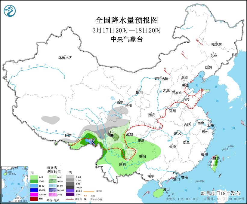 圖4 全國降水量預報圖(3月17日20時-18日20時)
