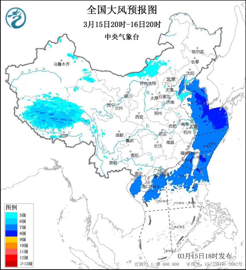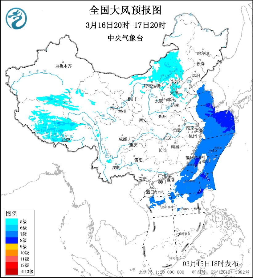 預計,3月15日20時至16日20時,新疆北疆山口地區、西藏中北部、內蒙古中部、山東半島、台灣島等地的部分地區有5~6級風,局地風力可達7級及以上;渤海、渤海海峽、黃海大部海域、東海大部海域、台灣海峽、台灣以東洋麪、南海北部和中西部海域、北部灣將有7~8級、陣風9級的大風。