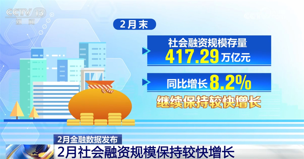 *央視網消息:*3月14日,中國人民銀行發佈2月金融數據。數據顯示,2月社會融資規模繼續保持較快增長。