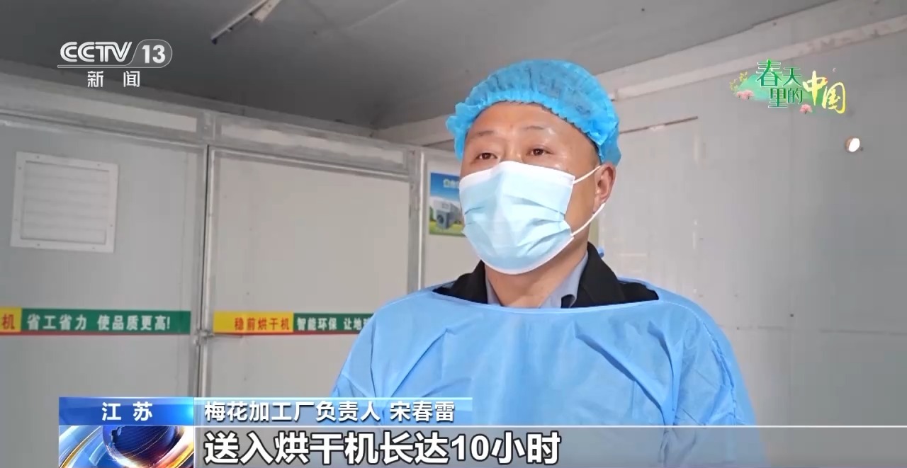 *梅花加工廠負責人 宋春雷:*將精挑細選的梅花,送入烘乾機長達10小時,這樣製作出的梅花茶具有清熱解毒、疏肝解鬱的功效,市場供不應求。