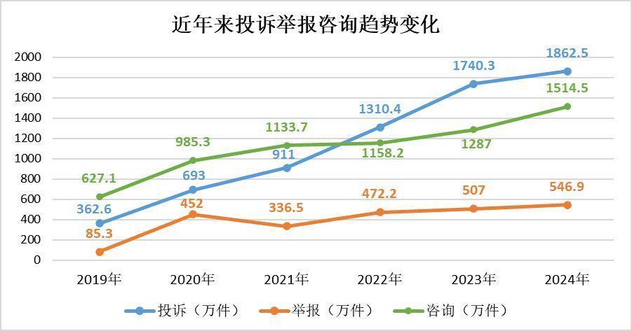 【環球網科技綜合報道】3月16日消息,記者近日從市場監管總局獲悉,2024年,全國市場監管部門通過全國12315平台、電話、傳真、窗口等渠道,共受理消費者投訴、舉報和諮詢3923.9萬件。其中,投訴1862.5萬件,舉報546.9萬件,諮詢1514.5萬件,為消費者挽回經濟損失51.6億元。