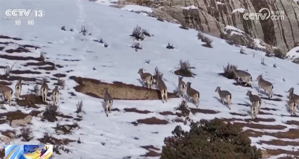 近日,在青海海西州德令哈市附近的柏樹山上,成羣岩羊現身雪後高原。畫面中,成羣的岩羊正往一處山坡上走,一會兒肆意奔跑,一會兒悠閒前行,還在一處山坡上駐足停留了片刻。