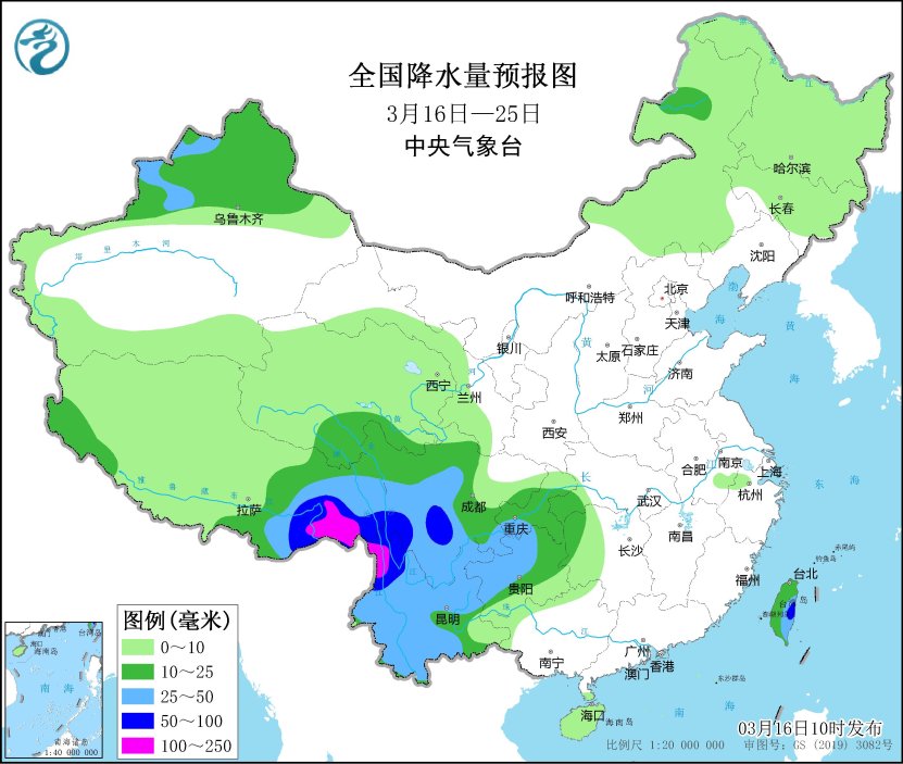 未來10天(3月16-25日),南方大部降雨稀少,多晴到多雲天氣。預計內蒙古東部、東北大部、江南西部、海南、台灣及西南地區等地累計降水量一般為10~20毫米,西南地區東部部分地區有40~60毫米,西藏東南部和雲南西北部的局部地區可達100毫米左右。