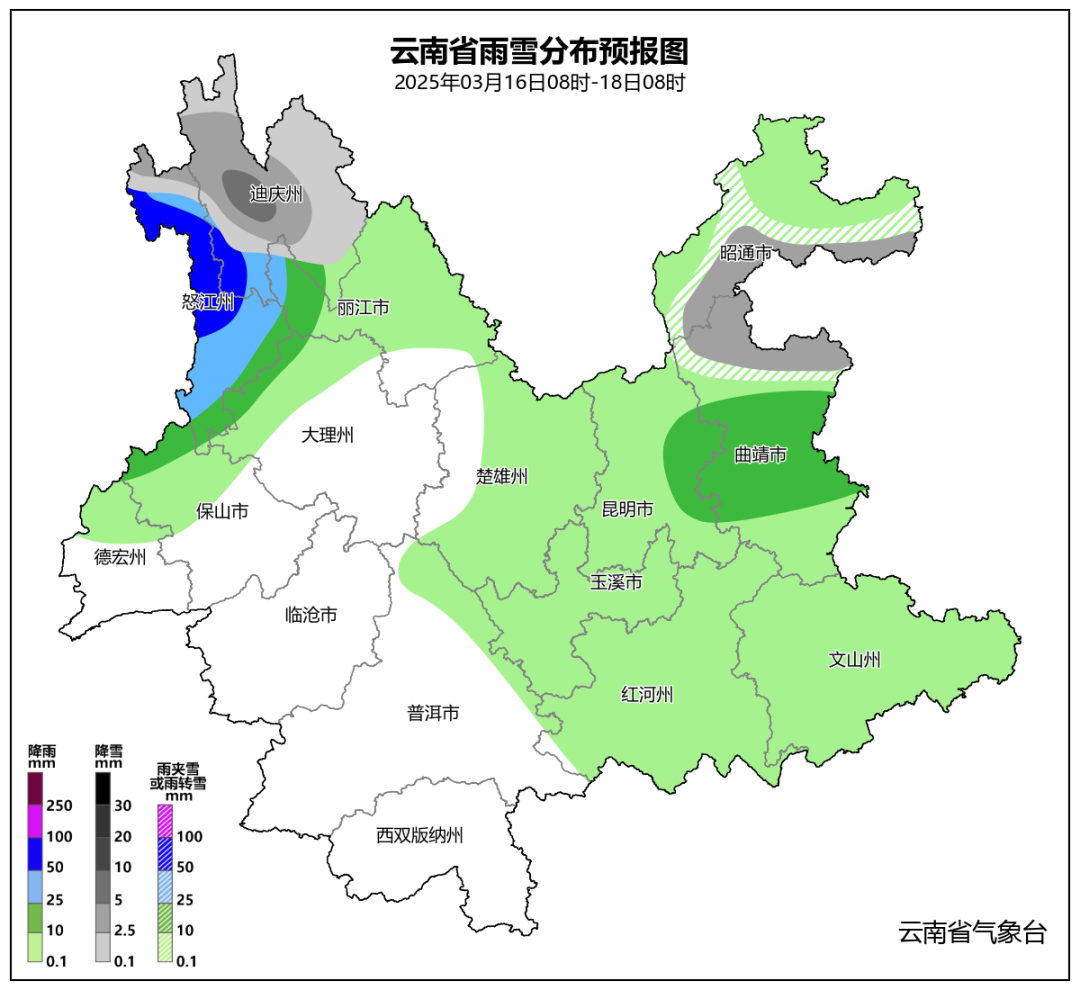 3月16日至17日:曲靖市西部、昆明市、楚雄州東部、玉溪市、文山州西部、紅河州最高氣温將下降6~10℃,局地超過12℃。怒江州北部、迪慶州西部有中到大雨,高海拔地區有中到大雪,昭通市、曲靖市北部、迪慶州東部的高海拔地區有小雪或雨夾雪,曲靖市南部、昆明市、楚雄州東部、玉溪市東部、文山州、紅河州東部和南部、麗江市北部、大理州西部、保山市北部有小雨局部中雨,其他地區多雲局部有陣雨。